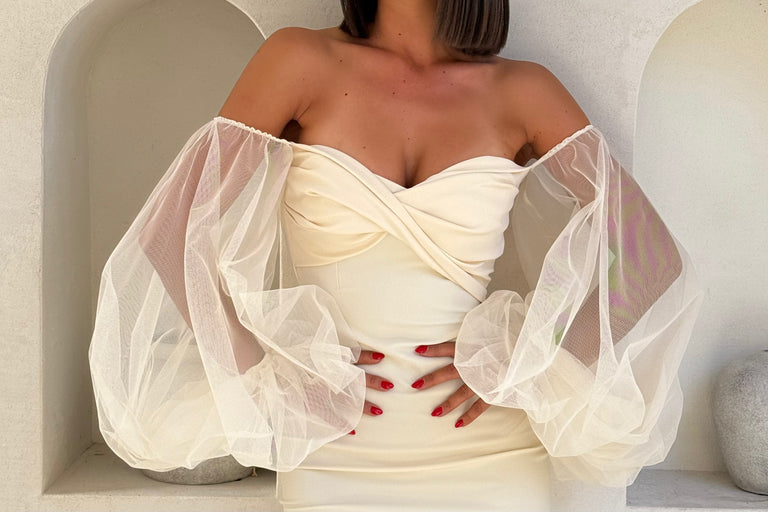Elegant dress with oversized details on one side.