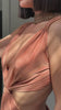 Long dress made of lycra, with a deep neckline and an open back. The front part is decorated with an effective draping that emphasizes the silhouette and adds a touch of drama.